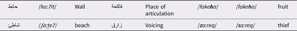 Phonological representations play a fundamental role in word reading development (Perfetti, Reference Perfetti2007; Perfetti & Hart, Reference Perfetti, Hart and Gorfien2001; Perfetti & Stafura, Reference Perfetti and Stafura2014), and in the development of other critical academic skills, such as phonological processing, word retrieval, word learning, word decoding, and reading comprehension (e.g., Gathercole & Baddeley, Reference Gathercole and Baddeley1990; Gray, Reference Gray2005; Nouwens, Groen, Kleemans, & Verhoeven, Reference Nouwens, Groen, Kleemans and Verhoeven2018; Perfetti, Wlotko, & Hart, Reference Perfetti, Wlotko and Hart2005; Verhoeven, Leeuwe, Irausquin, & Segers, Reference Verhoeven, van Leeuwel, Irausquin and Segers2016). This warrants an in-depth understanding of the linguistic factors that impact the establishment and development of phonological representations. Also warranted is an investigation of the role of sociolinguistic factors that pertain to language exposure and use on phonological representations, especially in bilectal and bilingual contexts (Gibson, Summers, Pena, Dedore, Gillam, & Bohman, Reference Gibson, Summers, Pena, Dedore, Gillam and Bohman2015; Saiegh-Haddad & Ghawi-Dakwar, Reference Saiegh-Haddad and Ghawi-Dakwar2017; Themistocleous, Reference Themistocleous2017). The current study investigates phonological representations in Arabic diglossia. In this context, children simultaneously develop two linguistic systems: Spoken Arabic (SpA) for everyday informal speech and Standard Arabic (StA) for formal speech and reading/writing. Importantly, the StA phonological form of the word may vary in extent of distance from (alternatively proximity or overlap with) its form in SpA, and this distance can range from almost identical to entirely different forms. The study tests the impact of the phonological distance between the SpA and StA forms on quality of phonological representations in children at different developmental stages from kindergarten to sixth grade. By studying the impact of the phonological distance between StA and SpA on the establishment and development of phonological representations in StA, this investigation will shed light on the factors that impact phonological representations in diglossic Arabic, in particular, and in analogous bilectal and bilingual contexts.