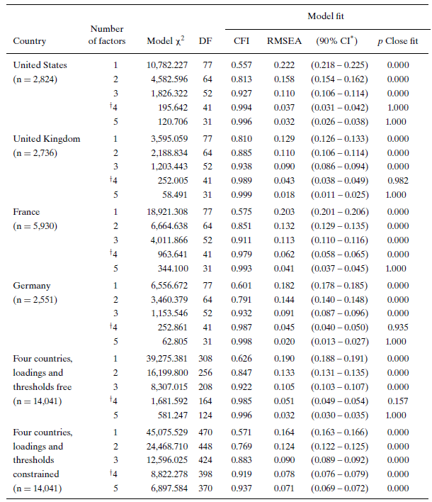 Before turning to a discussion of the substantive meaning of the factor structure we identify, we first discuss the process of choosing the appropriate number of factors. In examining models with one through five factors, the results point clearly toward a four‐factor model. Separate analyses by country and analyses of the pooled data with specifications for either configural equivalence or scalar equivalence tell the same story (see Table 3). Examining overall model fit, all of the models fit poorly based on the model Chi2 tests – though experienced latent variable modelers recognise that like all Chi2 tests, the model Chi2 statistics are sensitive to sample size and often indicate misfit in large samples (Kline Reference Kline2015). Given our large sample sizes, we turn to other, more frequently used measures of model fit offered in the SEM literature – in particular the RMSEA fit statistics emphasised by Preacher et al. (Reference Preacher2013) in their approach to selecting factor models.Footnote 5
