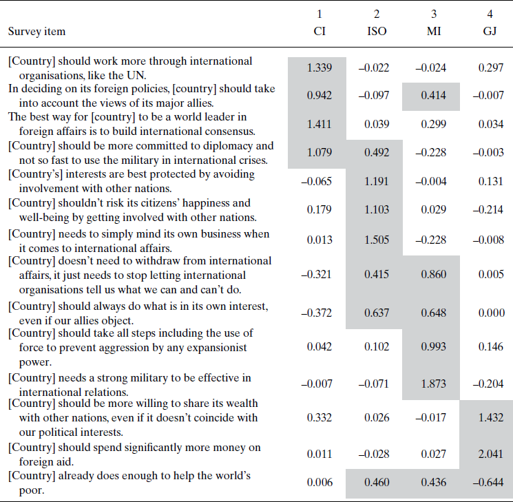 Notes: Shaded cells indicate salient factor loadings (≥ |0.400|). CI = cooperative internationalism; ISO = isolationism; MI = militant internationalism; GJ = global justice.