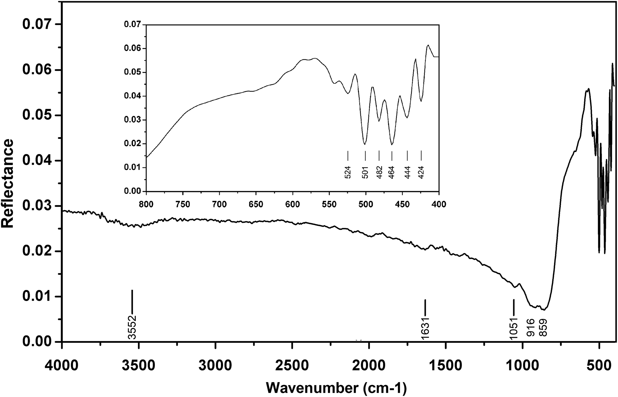 The infrared (IR) spectrum of a polished surface of hydroplumboelsmoreite was obtained using a Bruker27 IR microscope equipped with a liquid nitrogen-cooled detector in reflection mode. The spectrum in the range of 4000–400 cm–1 was collected by averaging 32 s scans at a resolution of 4 cm–1. The IR spectrum is shown in Fig. 3. The samples were stored at 110°C for 2 hours before the analysis to avoid the effect of adsorbed water on the test results. The 3552 cm−1(strong) and 1631 cm−1(medium) bands represent the stretching vibration and bending vibration of H2O, respectively. The IR absorption related to the W=O stretching vibration is represented by two peaks at 916(weak) and 859(weak) (Gadsden, Reference Gadsden1975; Farmer, Reference Farmer1982). All of the other bands in the 400–700 cm−1 range are due to the vibrations of the elsmoreite-type framework.