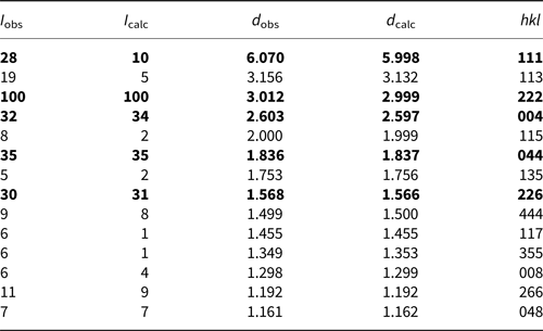 The powder X-ray diffraction data (Table 2) were obtained using a Rigaku Oxford Diffraction XtaLAB PRO-007HF (MoKα, 50 kV and 24 mA) by the powder rotations method, from the 0.2 mm × 0.2 mm × 0.2 mm aggregated fragment used for all the test. The powder X-ray diffraction pattern of hydroplumboelsmoreite (MoKα) is shown in Fig. 5. The five strongest powder X-ray diffraction lines [d in Å(I)(hkl)] are 6.070(28)(111), 3.012(100)(222), 2.603(32)(004), 1.836(35)(044) and 1.568(30)(226). The unit cell parameters refined from the powder-diffraction data using the Chekcell software (Jean and Bernard, Reference Jean and Bernard2001) are as follows: cubic, Fd $\bar{3}$m (#227), a = 10.388(11) Å, V = 1121(3) Å3 and Z = 8.