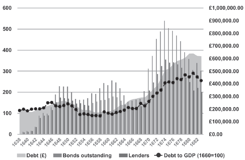 An important measure of financial development is the ratio of financial assets to GDP (Sahay et al. Reference Sahay, Martin Čihák, Adolfo Barajas and Diana Ayala2015).Footnote 23 The Corporation of London started to borrow using bonds in 1638, although it had already administered an Orphans Fund dated to the middle ages. We can see (Figure 2) that debt volumes rose during the English Civil War and declined during the Interregnum. Debt volumes increased again following the Restoration, and especially after the London Fire of 1666 and the reconstruction carried out by the Corporation. We can scale the debt volumes by British GDP (Broadberry et al. Reference Broadberry, Bruce Campbell, Overton and van Leeuwen2015) and show that this ratio did not exhibit a trend until the Restoration. However, after 1660 the Corporation of London’s debt to British GDP ratio tripled from about 0.4 percent to 1.2 percent of GDP.Footnote 24
