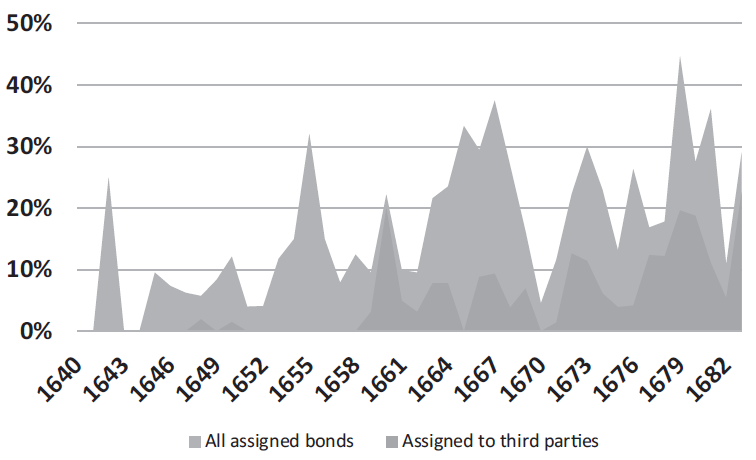 FIGURE 4 SHARE OF BONDS REDEEMED BY ASSIGNEES: 1640–1683