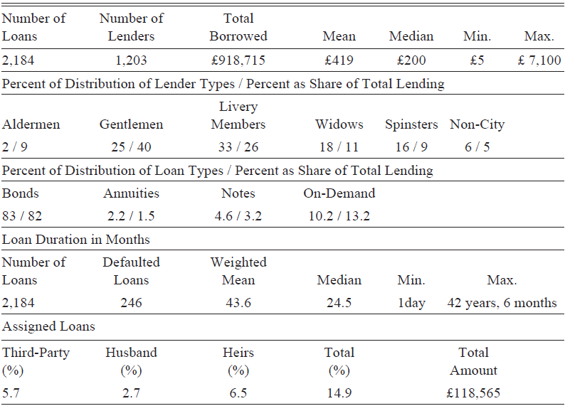 The Crown’s default in 1672—the “Stop of the Exchequer”—allows putting the lending to the Corporation of London in perspective. Carruthers (Reference Carruthers1999, p. 66) provides figures for the average amounts of debt assigned to the Crown’s individual creditors. The goldsmith-bankers intermediated the lending of individuals to the Crown. The average loan was £475 and is close to the average amount of borrowing by the Corporation. The average assigned loan held by a female was £294, which is similar to the average loan size of women to the Corporation, that is, £284. We can conclude that lending to the Corporation was, for individuals, an investment comparable to intermediated lending to the Crown.
