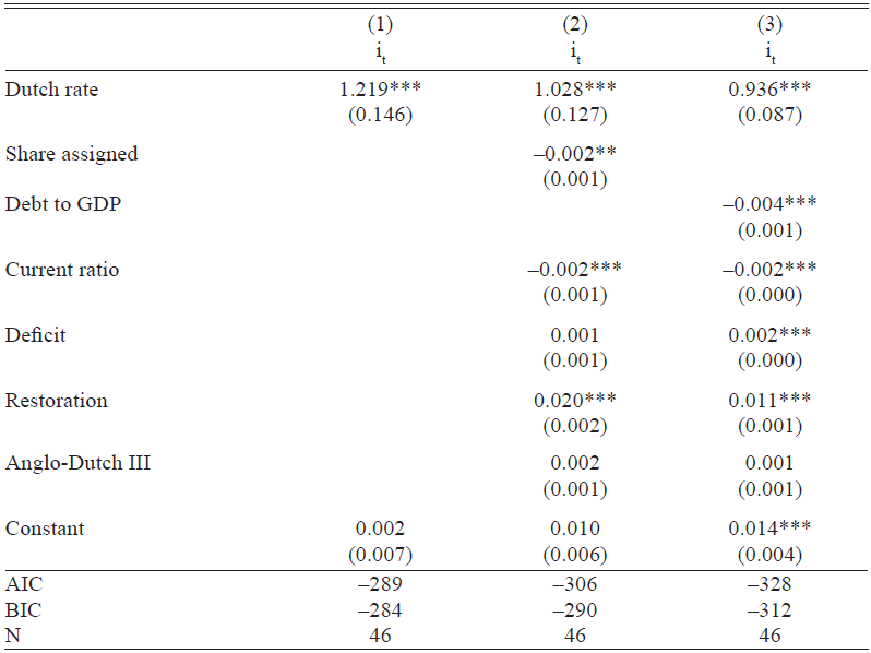 Interest rates in London not only co-moved with Amsterdam, but they also converged by 1680 (Figure 6). As captured by either the share of assigned bonds out of total bonds (Column (2)) or the Corporation debt to British GDP ratio (Column (3)), the liquidity premium contributed to this convergence. The regression results also show that the Corporation’s time-varying risk premium also significantly affected the Corporation’s borrowing costs. While the regression results (Columns (2) and (3)) are very similar, those based on the Corporation debt to British GDP ratio are somewhat more significant. The AIC and BIC information criteria point in that direction too. In the following analysis, we discuss the results reported in Column (3).Footnote 50