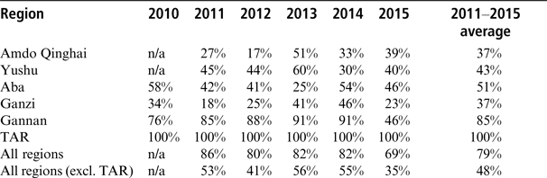 Outside of the TAR, we can discern basic policy changes in several regions starting in 2012 (see Figure 5). In that year, Amdo Qinghai introduced residency requirements for its public service positions, Aba TAP in Sichuan introduced residency requirements for its civil service positions, and Ganzi TAP in Sichuan introduced residency requirements for both public and civil service positions. Gannan started imposing higher shares of civil service residency restrictions in 2013. Given that civil service positions are targeted at higher-skilled applicants, they had typically been open to applicants from entire provinces, or even from the whole country. However, by 2014–2015, nearly half of all civil service positions outside of the TAR carried prefecture-level restrictions (48 per cent in 2014 and 41 per cent in 2015, compared to only 7 per cent in 2011). These increases are a sign that local governments of Tibetan-dominated prefectures are increasingly able (and willing) to meet their human resource needs with locals, likely as a result of improved educational levels.